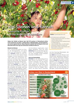 Um Obst geht es beim Unterrichtsmaterial "Von Steinen und Kernen" für die Primarstufe. Hier lernen Grundschüler, wie sie Stein- und Kernobst voneinander unterscheiden können und welche Merkmale die verschiedenen Obstsorten haben. Das Thema spannt einen Bogen vom Anbau bis zur Ernte, empfiehlt Theodor Fontanes Gedicht vom Birnbaum, das noch immer in vielen Lehrplänen aufgeführt wird, und unterstützt mit einem Extrablatt beim Einkauf, der Lagerung und Verarbeitung von Äpfeln und Aprikosen über Kirschen und Mirabellen bis zu Pfirsichen, Quitten und Zwetschgen.
