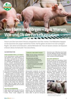 Die in der Landwirtschaft aktuelle Frage nach Alternativen zur betäubungslosen Ferkelkastration ist das Titelthema der neuen Ausgabe des Lehrermagazins. Während das Thema von Tierhalter*innen vor allem aus fachlicher Sicht betrachtet wird, behandeln wir es aus der Verbraucherperspektive: Vermeidung von Ebergeruch und -geschmack im Eberfleisch. Hierzu werden die verschiedenen Wege der Kastration und Ebermast beschrieben und Aspekte des Tierschutzes behandelt. Der Unterrichtsbaustein für den Einsatz in der Sekundarstufe zeigt auf, warum die Tiere überhaupt kastriert werden müssen.