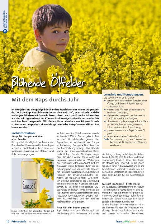 Mit diesem Unterrichtsbaustein können GrundschülerInnen beispielhaft eine wichtige heimische Nutzpflanze und ihren Anbau erkunden. Raps gehört als Mitglied der Familie der Kreuzblütler (Brassicaceae) botanisch gesehen zu den Kohlarten. Er ist aus einer spontanen Kreuzung von Rübsen und Kohl hervorgegangen.
