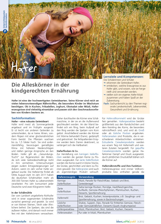 Hafer ist eine der hochwertigsten Getreidearten. Seine Körner sind reich an vielen lebensnotwendigen Nährstoffen, die besonders Kinder im Wachstum benötigen. Ob in Kuchen, Frikadellen, Joghurt, Obstsalat oder Müsli, Hafererzeugnisse sind vielseitig einsetzbar und passen sich den Geschmacksvorlieben von Kindern bestens an.