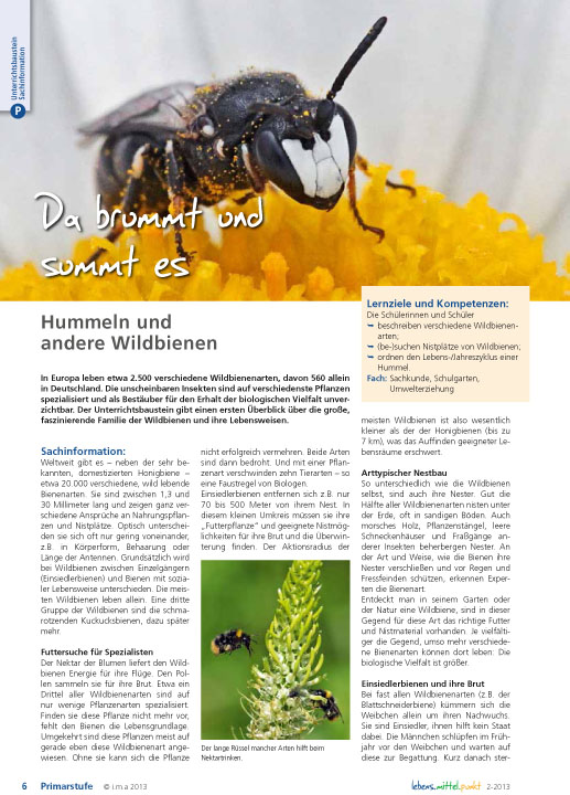 In Europa leben etwa 2.500 verschiedene Wildbienenarten, davon 560 allein in Deutschland. Die unscheinbaren Insekten sind auf verschiedenste Pflanzen spezialisiert und als Bestäuber für den Erhalt der biologischen Vielfalt unverzichtbar. Der Unterrichtsbaustein gibt einen ersten Überblick über die große, faszinierende Familie der Wildbienen und ihre Lebensweisen.