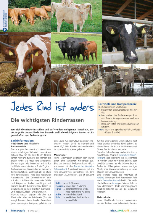 Wer sich die Rinder in Ställen und auf Weiden mal genauer anschaut, entdeckt große Unterschiede. Der Baustein stellt die wichtigsten Rassen mit Eigenschaften und Bedeutung vor. Das europäische Hausrind stammt von einem mächtigen Wildrind, dem Auerochsen bzw. Ur, ab. Bereits vor 10.000 Jahren hielt und züchtete der Mensch die ersten Rinder als Nutz- und Arbeitstier. Sie versorgten die Menschen mit Milch und Fleisch und dienten z.B. als Zugtier.