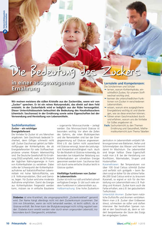 Wir meinen meistens die süßen Kristalle aus der Zuckerrübe, wenn wir von „Zucker“ sprechen. Er ist ein reines Naturprodukt, das direkt auf dem Feld entsteht. In der Zuckerfabrik wird er lediglich aus der Rübe herausgelöst. Dieser Unterrichtsbaustein beleuchtet die Bedeutung des Haushaltszuckers (chemisch: Saccharose) in der Ernährung sowie seine Eigenschaften bei der Verwendung und Herstellung von Lebensmitteln.