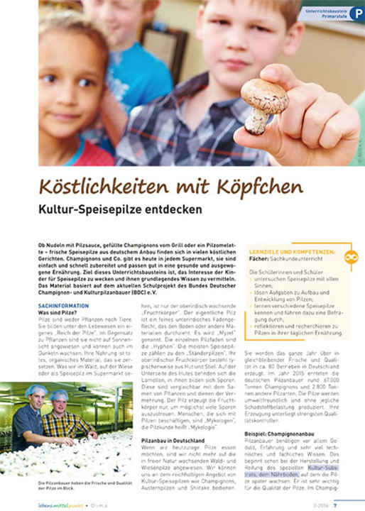 Ob Nudeln mit Pilzsauce, gefüllte Champignons vom Grill oder ein Pilzomelette – frische Speisepilze aus deutschem Anbau finden sich in vielen köstlichen Gerichten. Champignons und Co. gibt es heute in jedem Supermarkt, sie sind einfach und schnell zubereitet und passen gut in eine gesunde und ausgewogene Ernährung. Ziel dieses Unterrichtsbausteins ist, das Interesse der Kinder für Speisepilze zu wecken und ihnen grundlegendes Wissen zu vermitteln. Das Material basiert auf dem aktuellen Schulprojekt des Bundes Deutscher Champignon- und Kulturpilzanbauer (BDC) e. V.