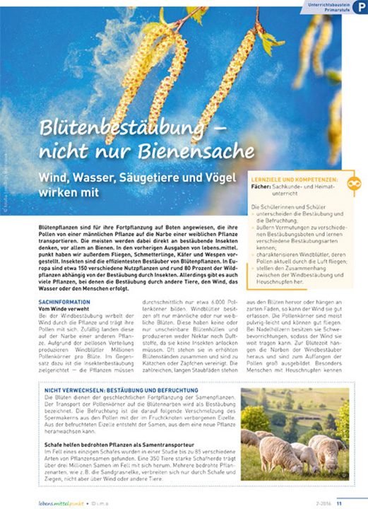 Blütenpflanzen sind für ihre Fortpflanzung auf Boten angewiesen, die ihre Pollen von einer männlichen Pflanze auf die Narbe einer weiblichen Pflanze transportieren. Die meisten werden dabei direkt an bestäubende Insekten denken, vor allem an Bienen. In den vorherigen Ausgaben von lebens.mittel.punkt haben wir außerdem Fliegen, Schmetterlinge, Käfer und Wespen vorgestellt. Insekten sind die effizientesten Bestäuber von Blütenpflanzen. In Europa sind etwa 150 verschiedene Nutzpflanzen und rund 80 Prozent der Wildpflanzen abhängig von der Bestäubung durch Insekten. Allerdings gibt es auch viele Pflanzen, bei denen die Bestäubung durch andere Tiere, den Wind, das>Wasser oder den Menschen erfolgt.