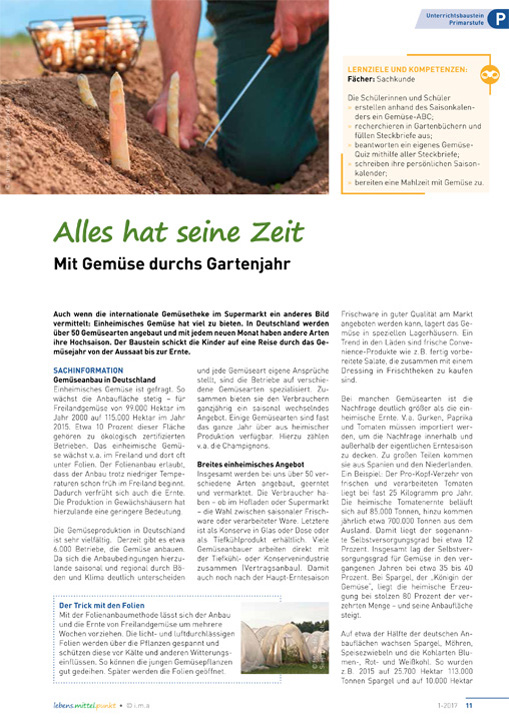 Auch wenn die internationale Gemüsetheke im Supermarkt ein anderes Bild vermittelt: Einheimisches Gemüse hat viel zu bieten. In Deutschland werden über 50 Gemüsearten angebaut und mit jedem neuen Monat haben andere Arten ihre Hochsaison. Der Baustein schickt die Kinder auf eine Reise durch das Gemüsejahr von der Aussaat bis zur Ernte.