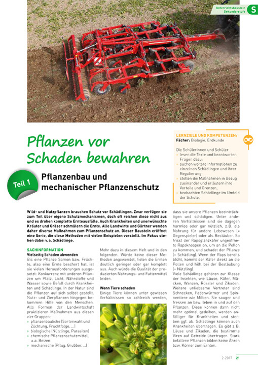Wild- und Nutzpflanzen brauchen Schutz vor Schädlingen. Zwar verfügen sie zum Teil über eigene Schutzmechanismen, doch oft reichen diese nicht aus und es drohen komplette Ernteausfälle. Auch Krankheiten und unerwünschte Kräuter und Gräser schmälern die Ernte. Alle Landwirte und Gärtner wenden daher diverse Maßnahmen zum Pflanzenschutz an. Dieser Baustein eröffnet eine Serie, die diese Methoden mit vielen Beispielen vorstellt. Im Fokus stehen dabei v. a. Schädlinge.