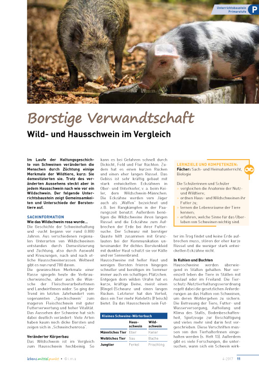 Im Laufe der Haltungsgeschichte von Schweinen veränderten die Menschen durch Züchtung einige Merkmale der Wildtiere, kurz: Sie domestizierten sie. Trotz des veränderten Aussehens steckt aber in jedem Hausschwein nach wie vor ein Wildschwein. Der folgende Unterrichtsbaustein zeigt Gemeinsamkeiten und Unterschiede der Borstentiere auf.