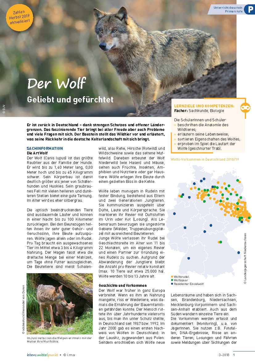 Er ist zurück in Deutschland – dank strengen Schutzes und offener Ländergrenzen. Das faszinierende Tier bringt bei aller Freude aber auch Probleme und viele Fragen mit sich. Der Baustein stellt das Wildtier vor und erläutert, was seine Rückkehr in die deutsche Kulturlandschaft mit sich bringt.