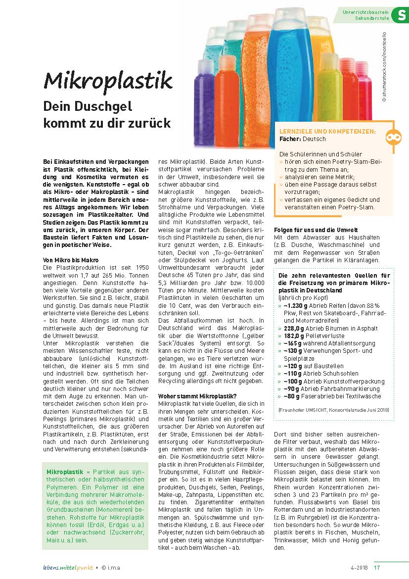 Bei Einkaufstüten und Verpackungen ist Plastik offensichtlich, bei Kleidung und Kosmetika vermuten es die wenigsten. Kunststoffe – egal ob als Mikro- oder Makroplastik – sind mittlerweile in jedem Bereich unseres Alltags angekommen: Wir leben sozusagen im Plastikzeitalter. Und Studien zeigen: Das Plastik kommt zu uns zurück, in unseren Körper. Der Baustein liefert Fakten und Lösungen in poetischer Weise.