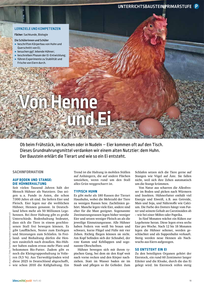 Ob beim Frühstück, im Kuchen oder in Nudeln – Eier kommen oft auf den Tisch. Dieses Grundnahrungsmittel verdanken wir einem alten Nutztier: dem Huhn. Der Baustein erklärt die Tierart und wie so ein Ei entsteht.