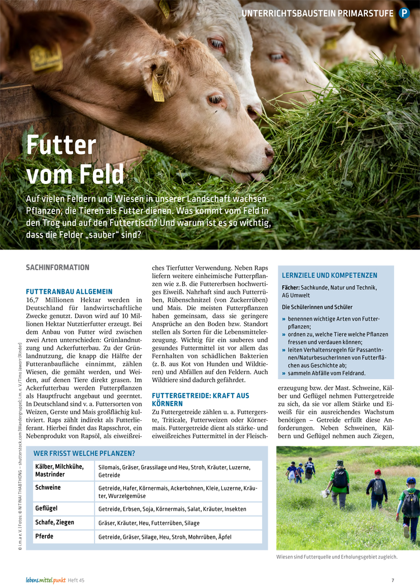 Auf vielen Feldern und Wiesen in unserer Landschaft wachsen Pflanzen, die Tieren als Futter dienen. Was kommt vom Feld in den Trog und auf den Futtertisch? Und warum ist es so wichtig, dass die Felder "sauber" sind?