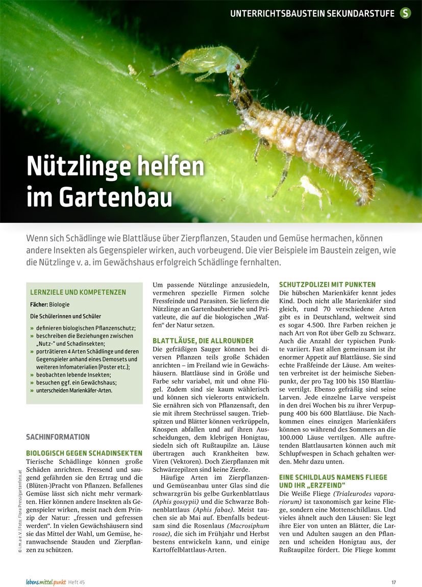 Wenn sich Schädlinge wie Blattläuse über Zierpflanzen, Stauden und Gemüse hermachen, können andere Insekten als Gegenspieler wirken, auch vorbeugend. Die vier Beispiele im Baustein zeigen, wie die Nützlinge v. a. im Gewächshaus erfolgreich Schädlinge fernhalten.