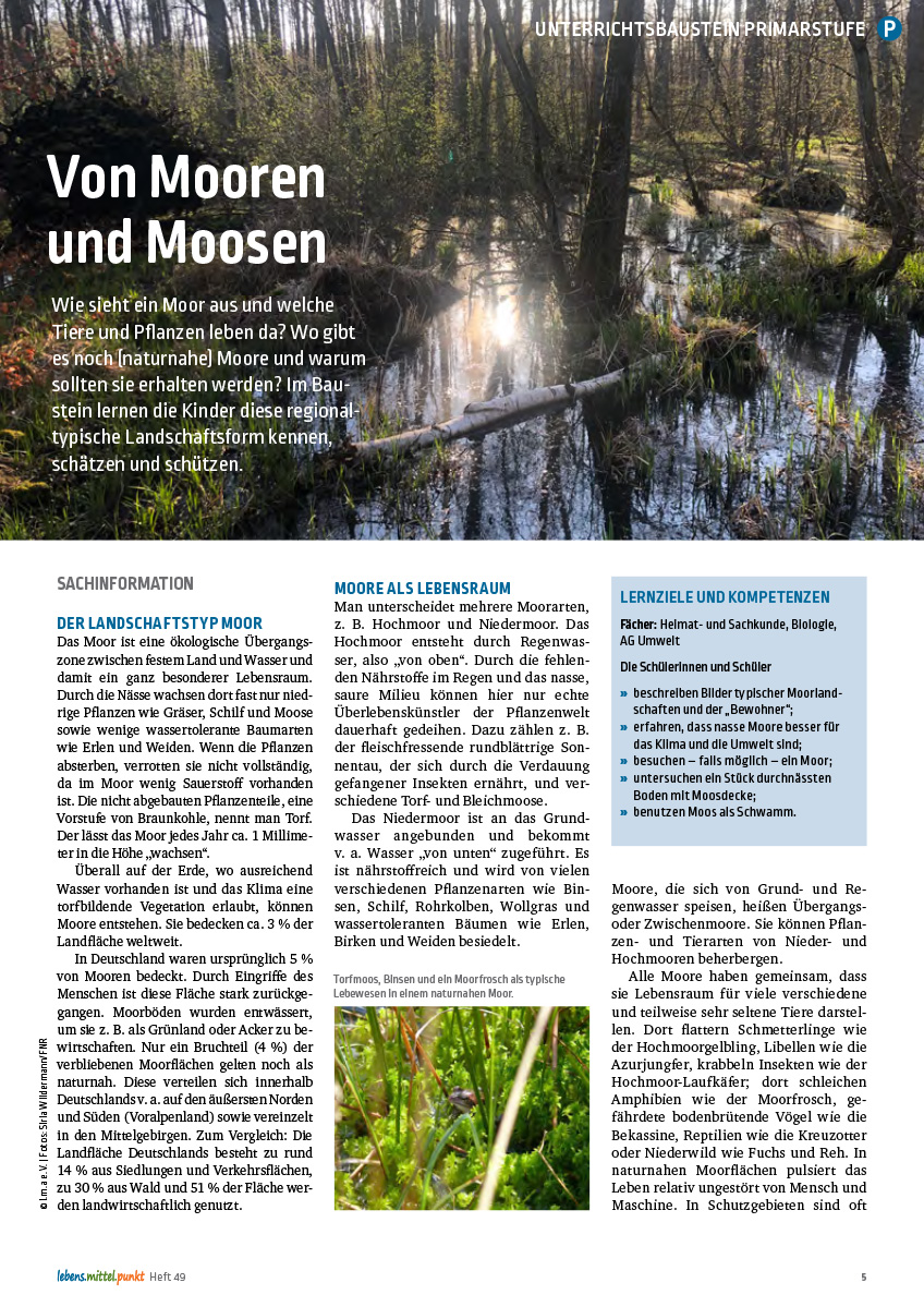 Wie sieht ein Moor aus und welche Tiere und Pflanzen leben da? Wo gibt es noch (naturnahe) Moore und warum sollten sie erhalten werden? Im Baustein lernen die Kinder diese regionaltypische Landschaftsform kennen, schätzen und schützen.