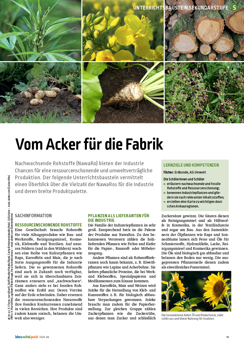 Nachwachsende Rohstoffe (NawaRo) bieten der Industrie Chancen für eine ressourcenschonende und umweltverträgliche Produktion. Der folgende Unterrichtsbaustein vermittelt einen Überblick über die Vielzahl der NawaRos für die Industrie und deren breite Produktpalette.