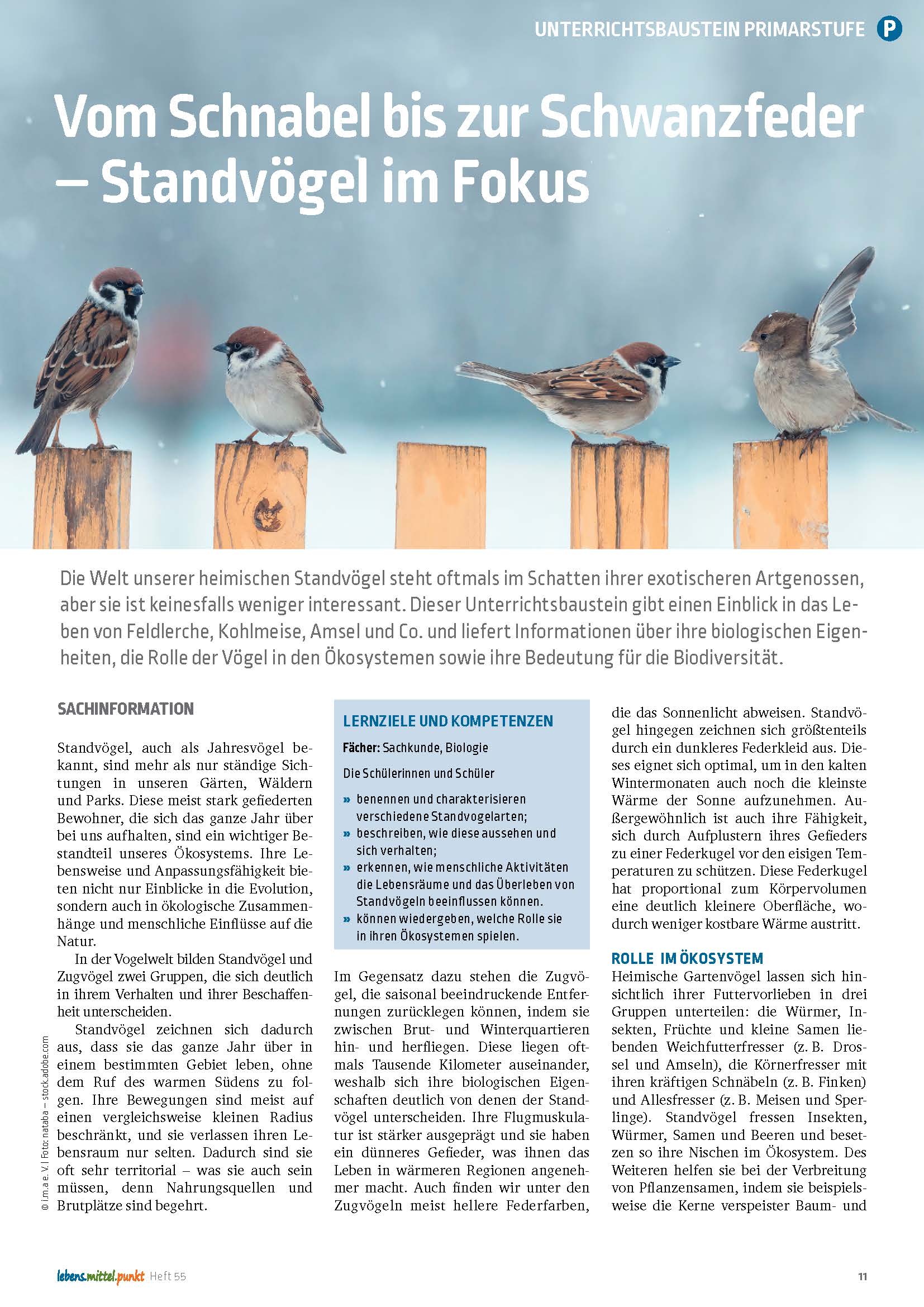 Die Welt unserer heimischen Standvögel steht oftmals im Schatten ihrer exotischeren Artgenossen, aber sie ist keinesfalls weniger interessant. Dieser Unterrichtsbaustein gibt einen Einblick in das Leben von Feldlerche, Kohlmeise, Amsel und Co. und liefert Informationen über ihre biologischen Eigenheiten, die Rolle der Vögel in den Ökosystemen sowie ihre Bedeutung für die Biodiversität. Lösungsblätter zum Download finden Sie unter www.ima-shop.de/lmp-55