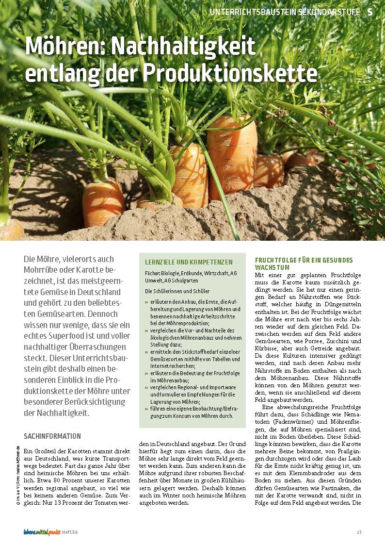 Die Möhre, vielerorts auch Mohrrübe oder Karotte bezeichnet, ist das meistgeerntete Gemüse in Deutschland und gehört zu den beliebtesten Gemüsearten. Dennoch wissen nur wenige, dass sie ein echtes Superfood ist und voller nachhaltiger Überraschungen steckt. Dieser Unterrichtsbaustein gibt einen Einblick in die Produktionskette der Möhre unter besonderer Berücksichtigung der Nachhaltigkeit.