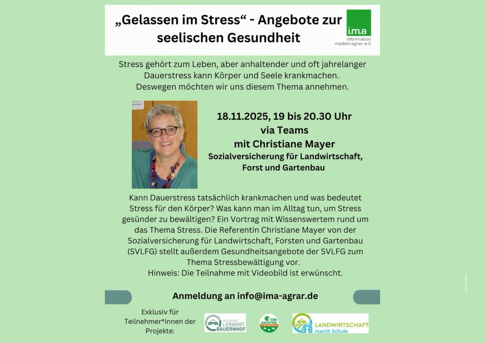 Abends um 19.00 Uhr erwartet Christiane Mayer interessierte Teilnehmer zu ihrem Online-Seminar „Gelassen im Stress“. Die Referentin vom Gesundheitsteam der Sozialversicherung für Landwirtschaft, Forsten und Gartenbau will „Angebote zur seelischen Gesundheit“ machen. Denn neben der körperlichen Anstregung bei der Arbeit auf einem Bauernhof belasten immer wieder auch seelische Probleme die Gesundheit. Wie sich damit umgehen lässt und welche Wege sich aus der Belastung heraus finden lassen, wird in dem Seminar erläutert.