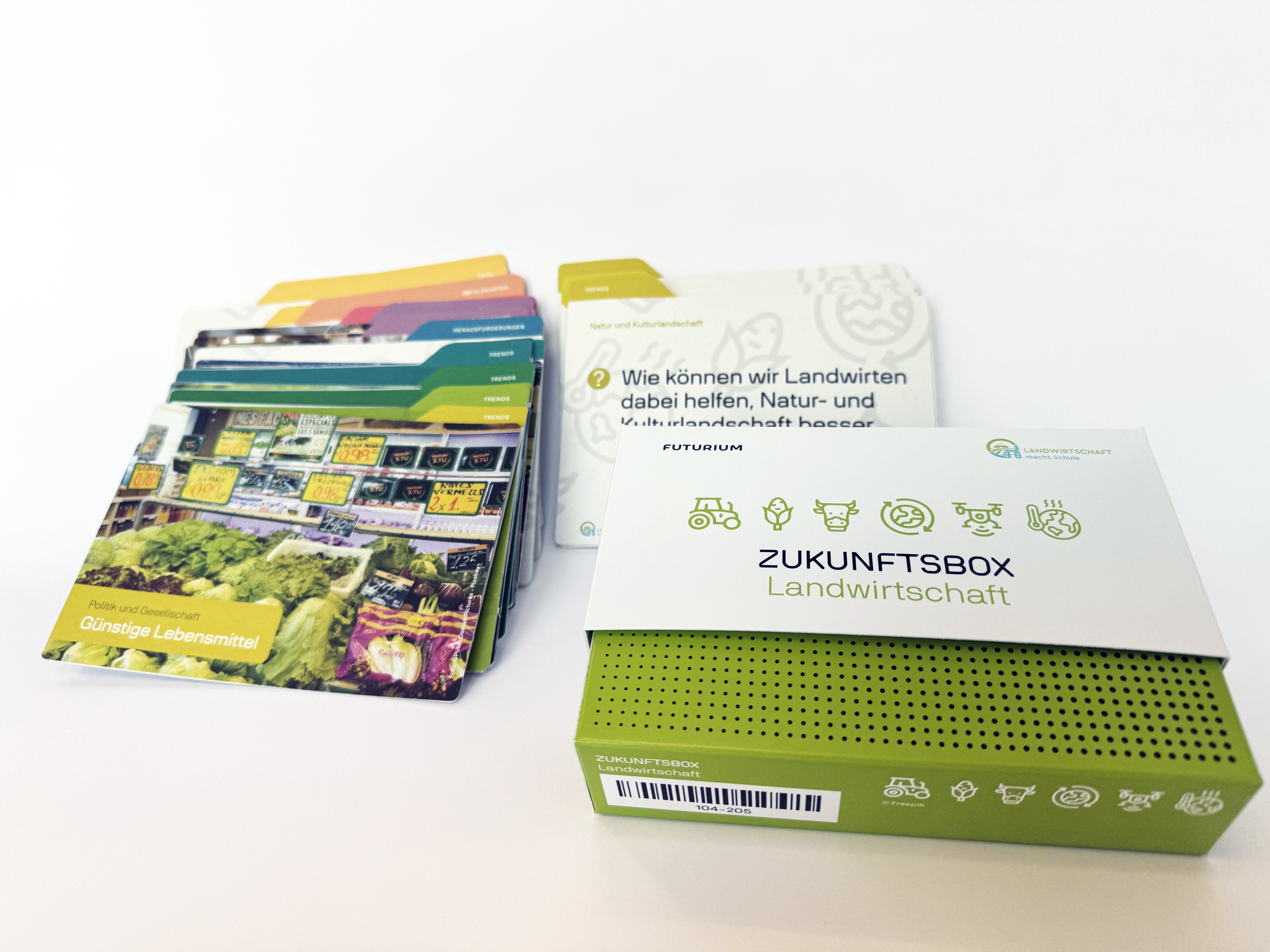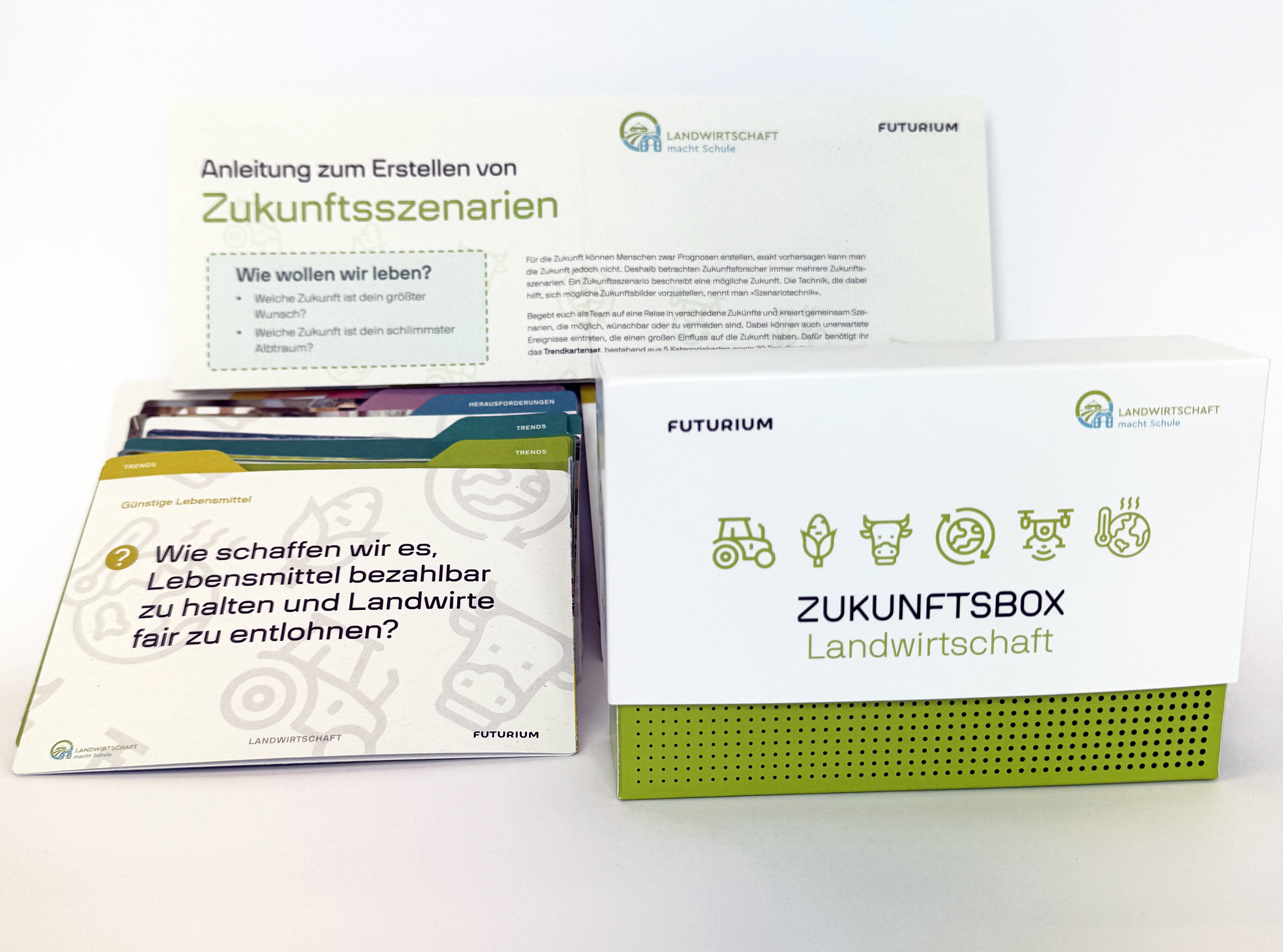 Die Zukunftsbox Landwirtschaft eignet sich insbesondere auch für den Einsatz im Schulunterricht. Sie ist ein Projekt der i.m.a-Bildungsinitiative „Landwirtschaft macht Schule“ und wurde entwickelt von Lehramtsstudenten der Carl von Ossietzky-Universität Oldenburg und der Pädagogischen Hochschule Freiburg sowie von Agrarstudenten der Universität Hohenheim. Das Spiel besteht aus 51 Spielkarten, die in einer handlichen Box zusammengefasst sind. Ein Glossar erläutert Fachbegriffe. Für 12,95 Euro kann die Zukunftsbox im i.m.a-webshop bestellt werden.