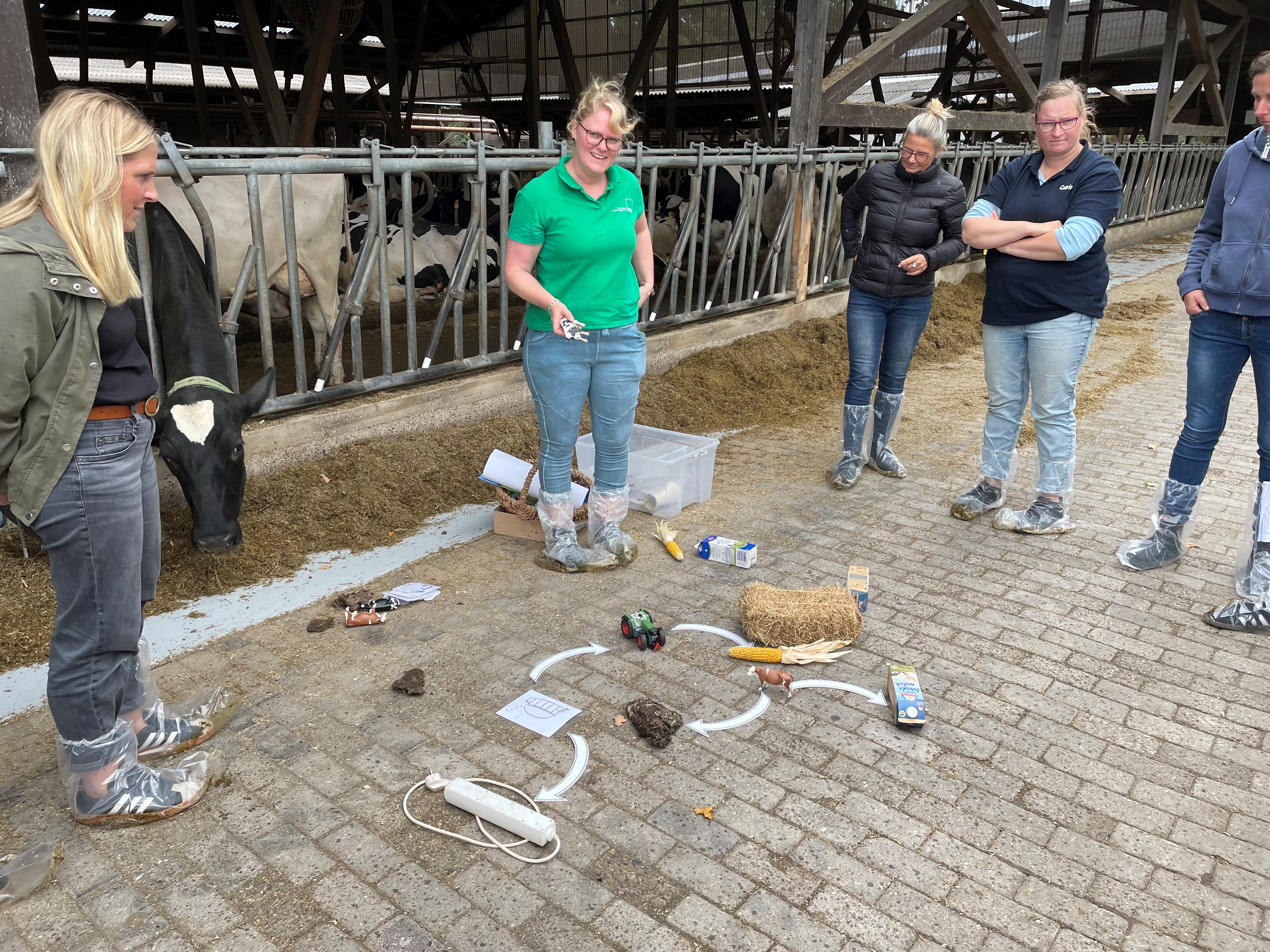 Am Beispiel einer Kuh wurde veranschaulicht, welche Zusammenhänge zwischen dem Futter des Tieres, dem Klima und unserem Lebensmittelkonsum bestehen, und welche Rolle dabei der Nährstoffkreislauf in der Landwirtschaft spielt. Um dies zu verdeutlichen, wurden mit den Lehrerinnen und Bauernhofpädagoginnen die gleichen Lernstationen absolviert, die später auch von den Schulkindern bewältigt werden sollen.