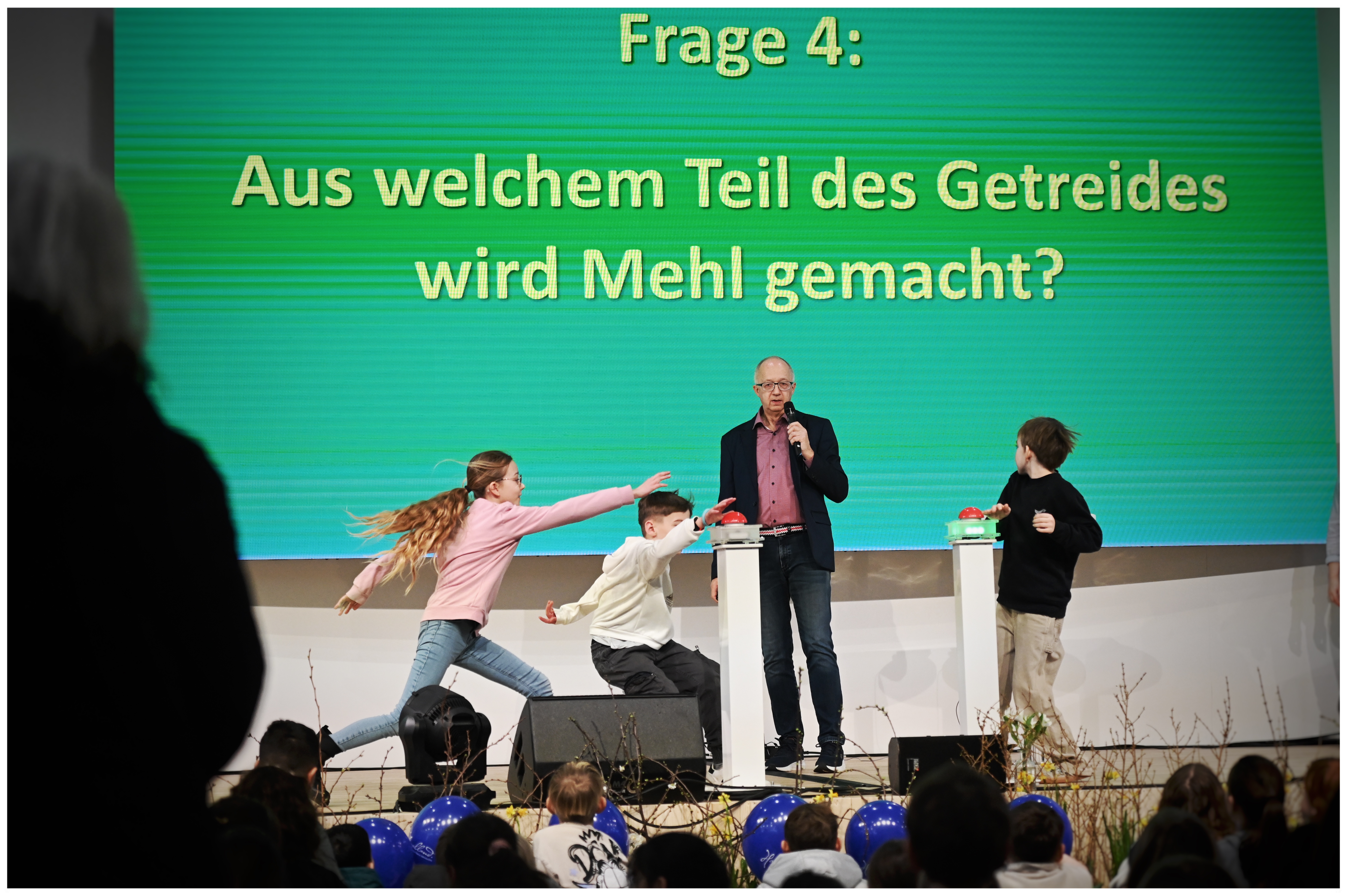 Die Fragen, die i.m.a-Pressesprecher und Moderator Bernd Schwintowski den Kindern stellte, waren dem Alter der Zielgruppe und den Lehrplänen der Schulen angepasst. Mal wurde nach dem Getreide gefragt, das am häufigsten für die Brotproduktion verwendet wird (Weizen), dann sollte geschätzt werden, ob eine Kuh am Tag 16, 28 oder 35 Liter Milch gibt (28) oder wie viele Eier eine Henne im Jahr legt (ca. 320). Interpretationsspielraum gab es bei Fragen nach der Bedeutung von Bienen für die Landwirtschaft oder wann Getreide geerntet wird.